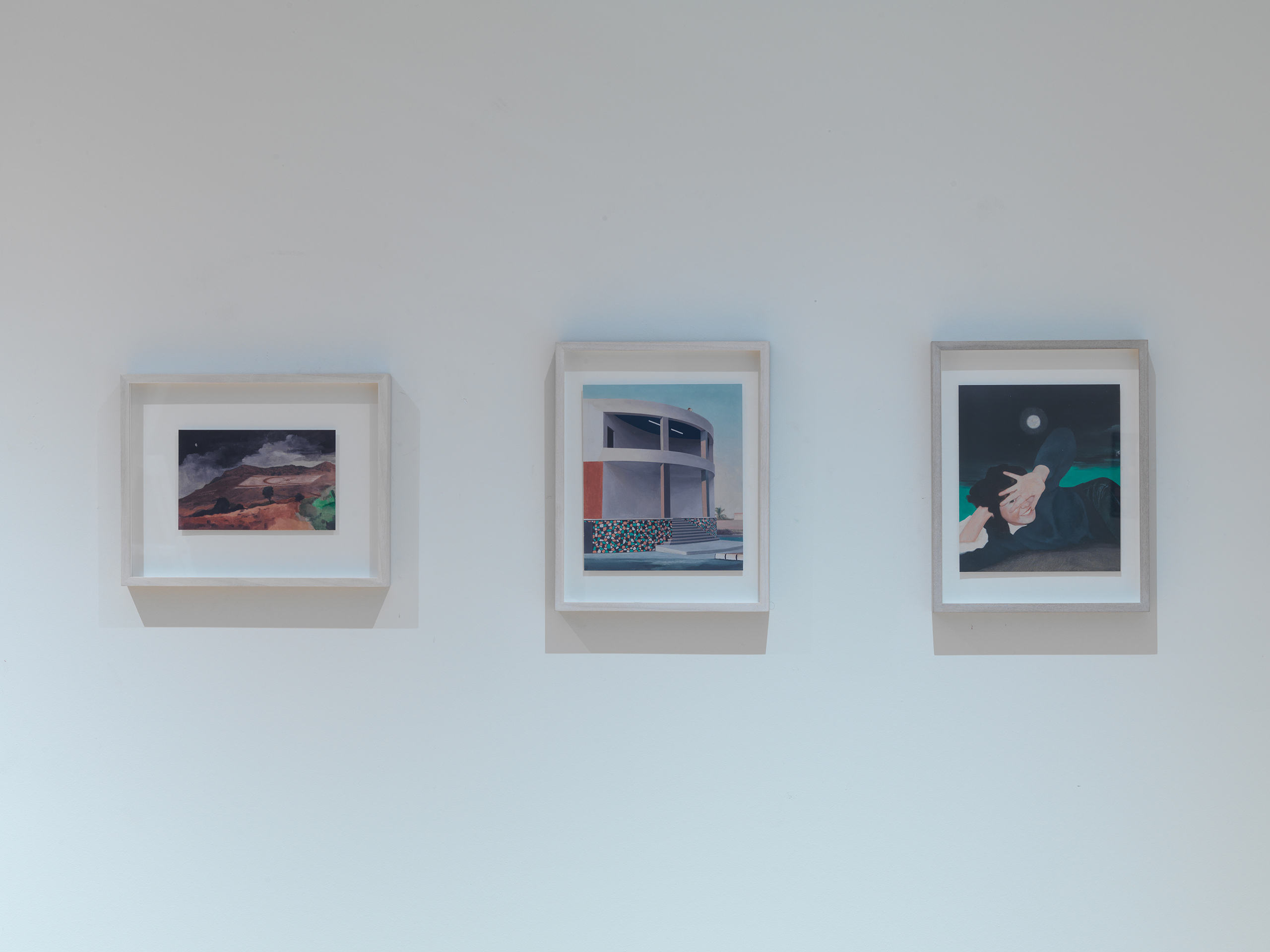 Despite the scene’s hermetic surface, the work makes clear that heritage, local histories, personal relationships, and peer networks were not absent from Çerkez’s practice but foundational to it—woven through the work rather than eclipsed by its conceptual structures or his refusal of conventional self-expression and collaboration. What can appear opaque from the outside is, in fact, sustained by lived ties, by the geographies and relationships that shaped his life-as-work. Beyond the poster-design tributes to his peers and idols, other works from this homecoming trip make this apparent too: paintings imagining the future drowning of Cyprus and its speculative division into two islands (both the imagined result of a natural catastrophe and a proposed resolution to the ongoing conflict); a nocturnal mountain landscape bearing the Turkish flag; or an image of rubble on the building site of his homeall map the relational and geographic foundations of Çerkez’s practice as decisively as its structural propositions.