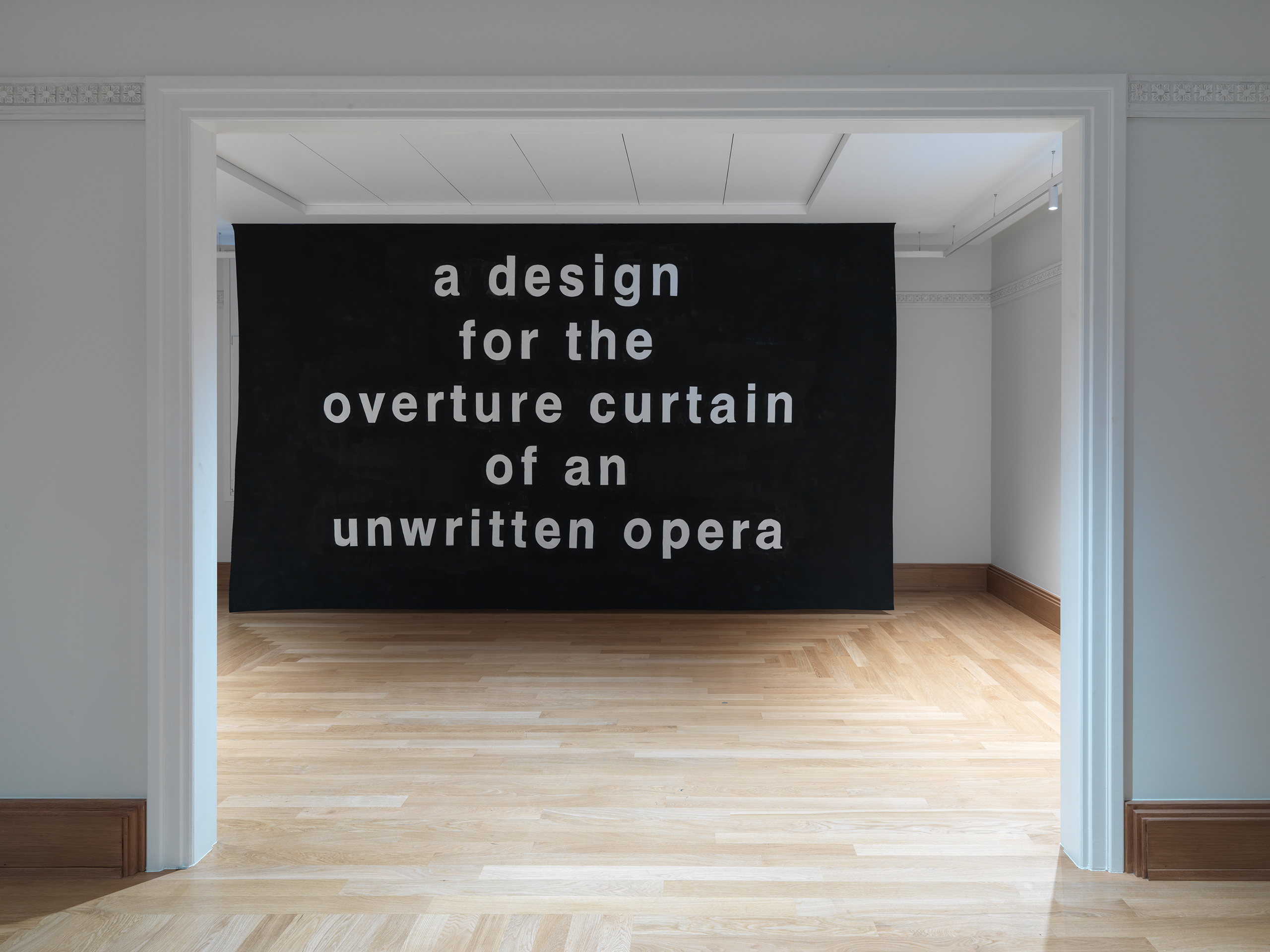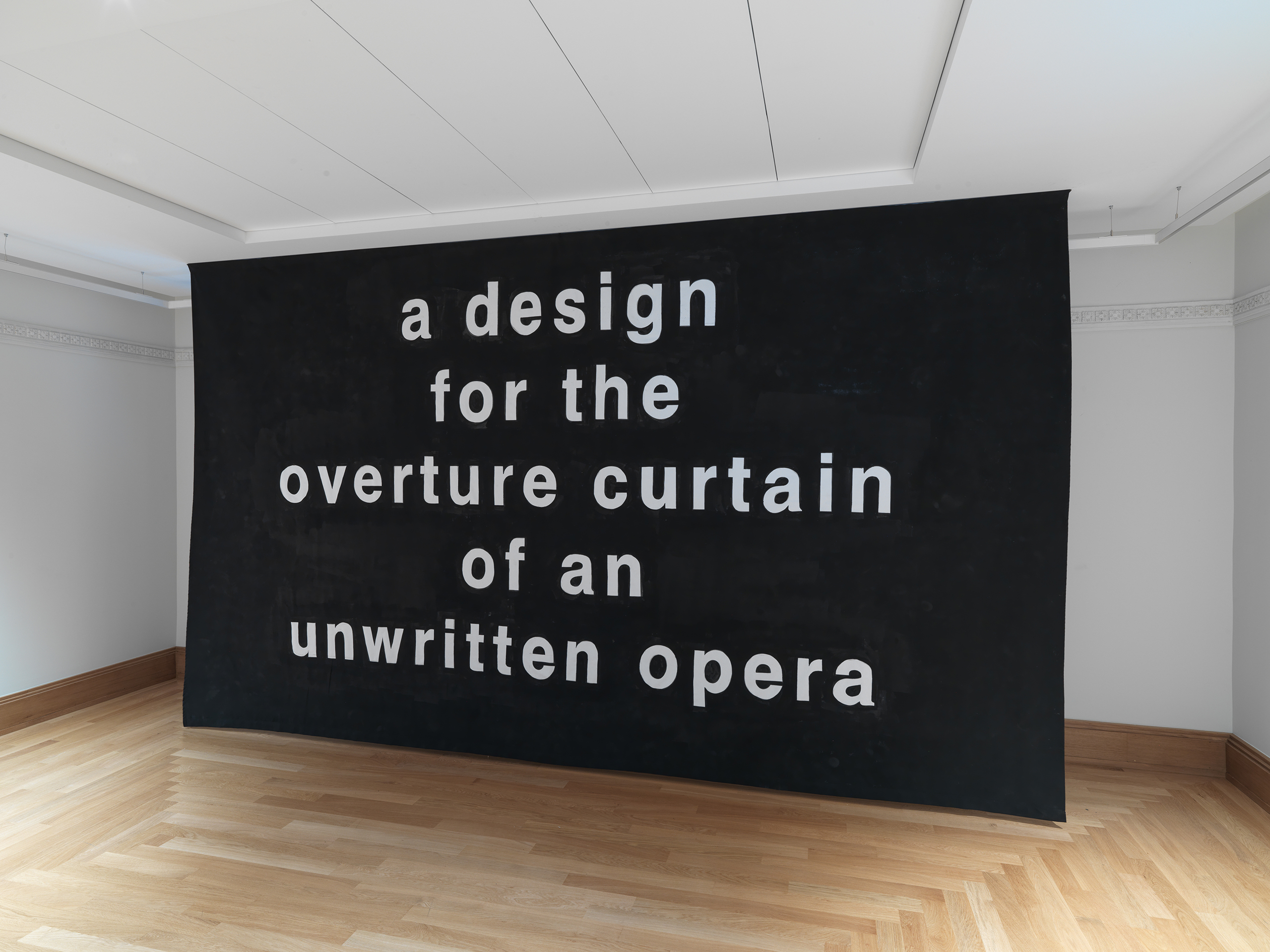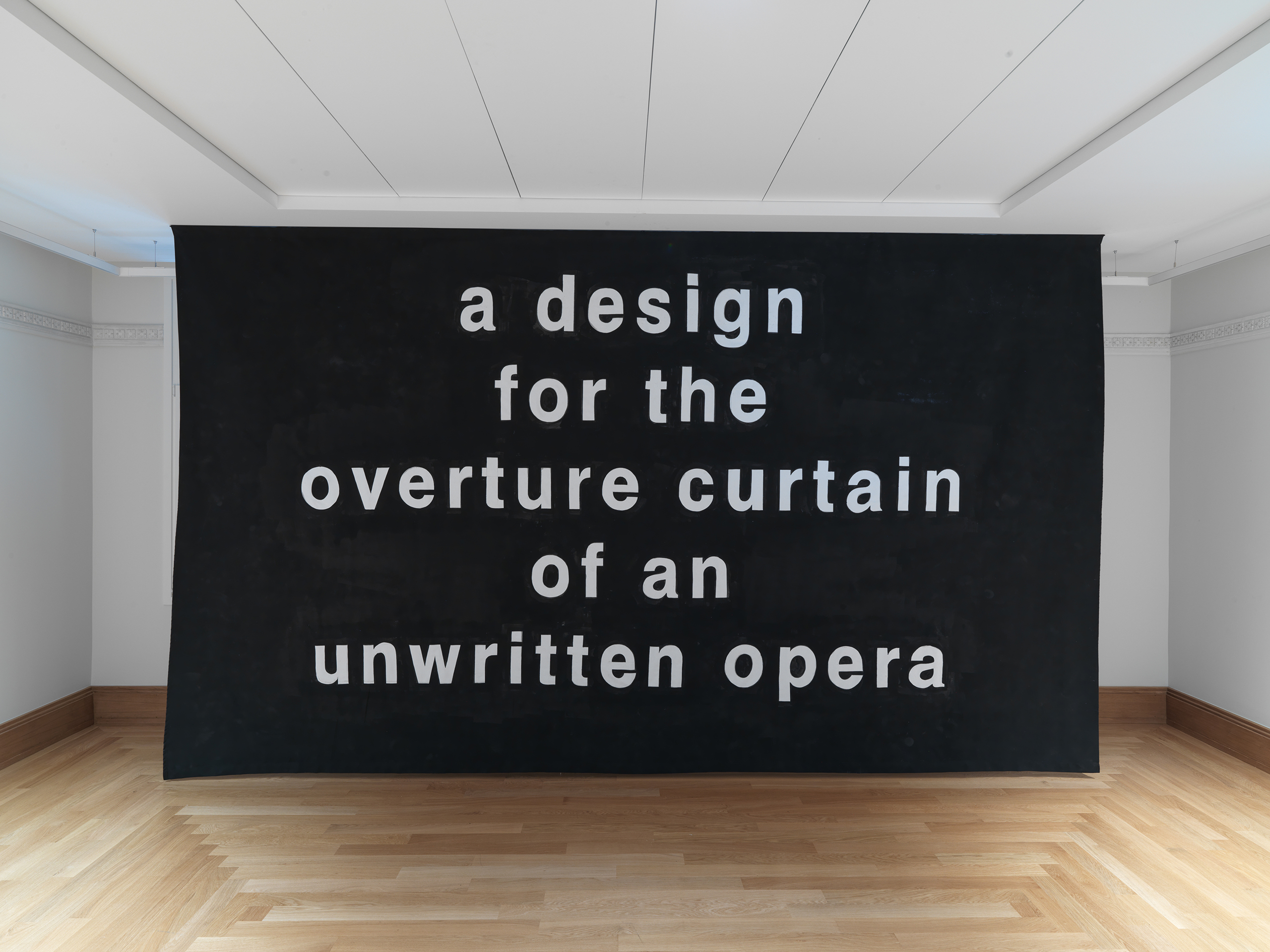 Like the Marshall stack–now turned on but unplugged, itself also a contradictory setting–which was centered in Act I, the curtain bearing the phrase “design for the overture curtain of an unwritten opera” sits firmly within the ongoing series An unwritten opera. The curtain wears its contradictions on its sleeve: the moment we read it, the work discloses its recursive structure. The “design” is in fact the curtain, and the curtain is already performing its role as an overture, but there is no opera. The finished work is only a proposal, yet the proposal is already complete. We stand before something that is both about to begin and already underway—an opening that starts, and ends, the instant we encounter it.